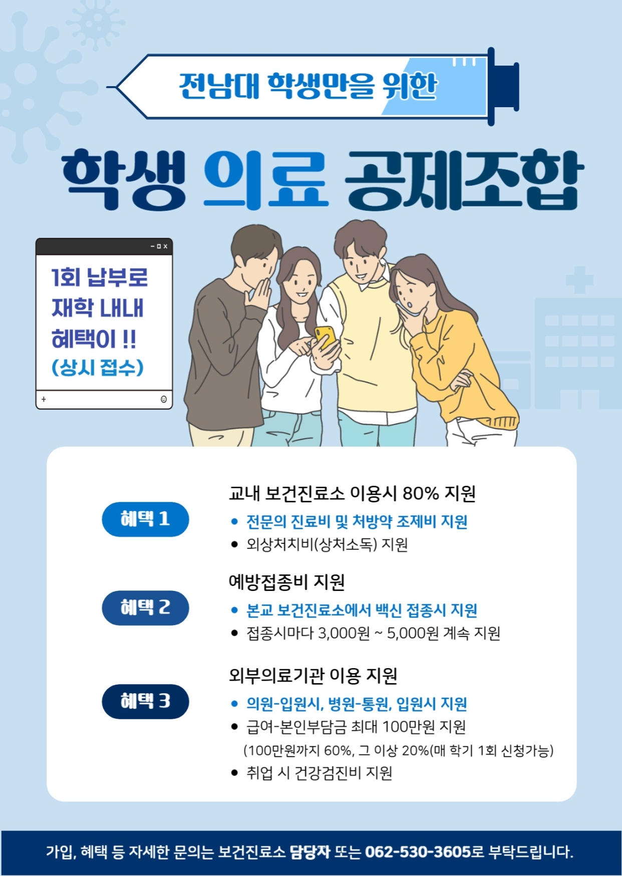 재학생의 건강 증진과 의료비 부담 경감을 위하여 '학생의료공제조합'을 운영중에 있습니다. 조합은 다양한 의료 혜택을 제공하고 있으니, 아래의 내용을 참조하시어 학생의료공제조합의 가입 및 이용을 안내드립니다.