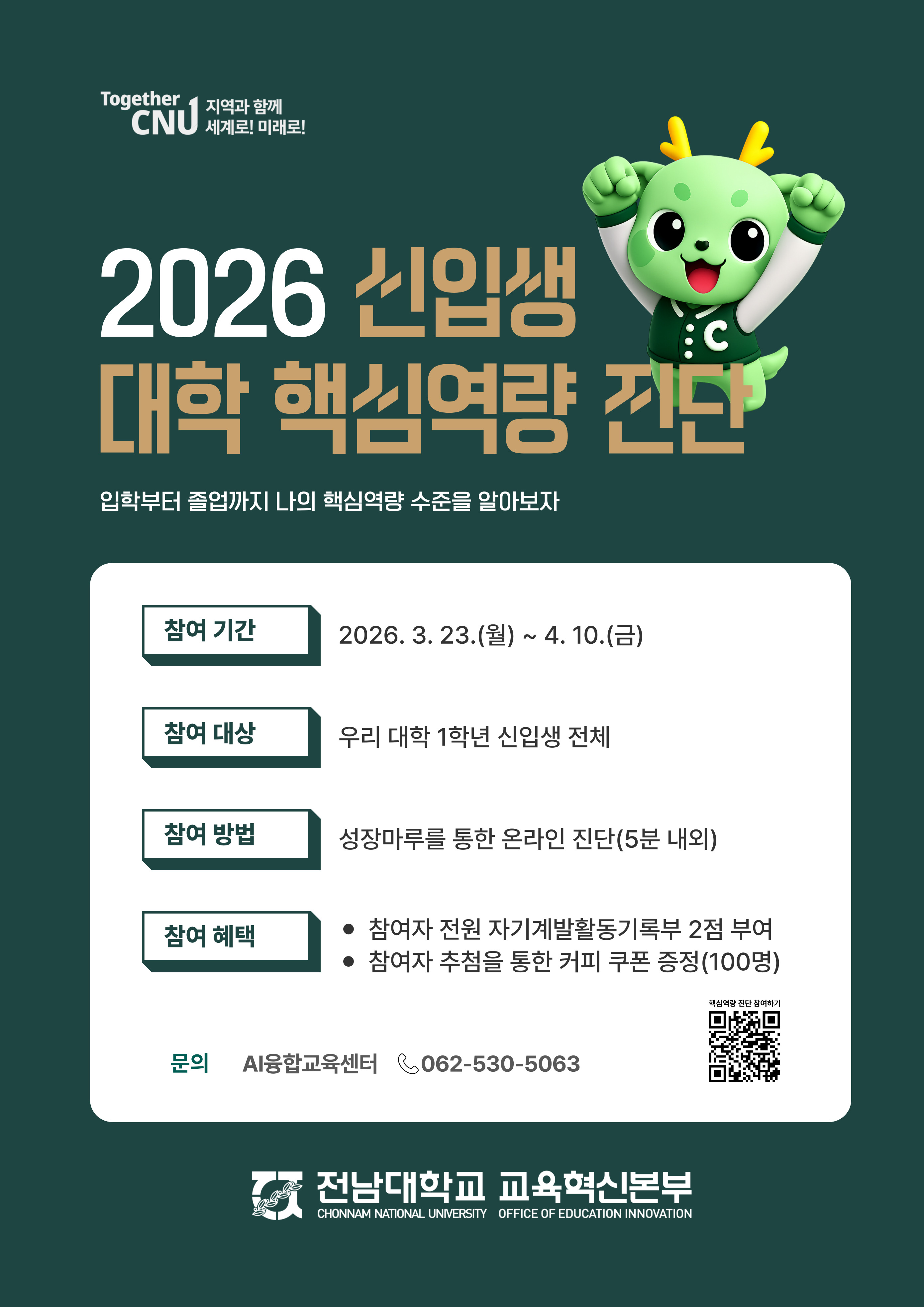 교육혁신본부에서는 우리 대학 신입생을 대상으로 2026학년도 신입생 대학 핵심역량 진단을 실시하고자 합니다.