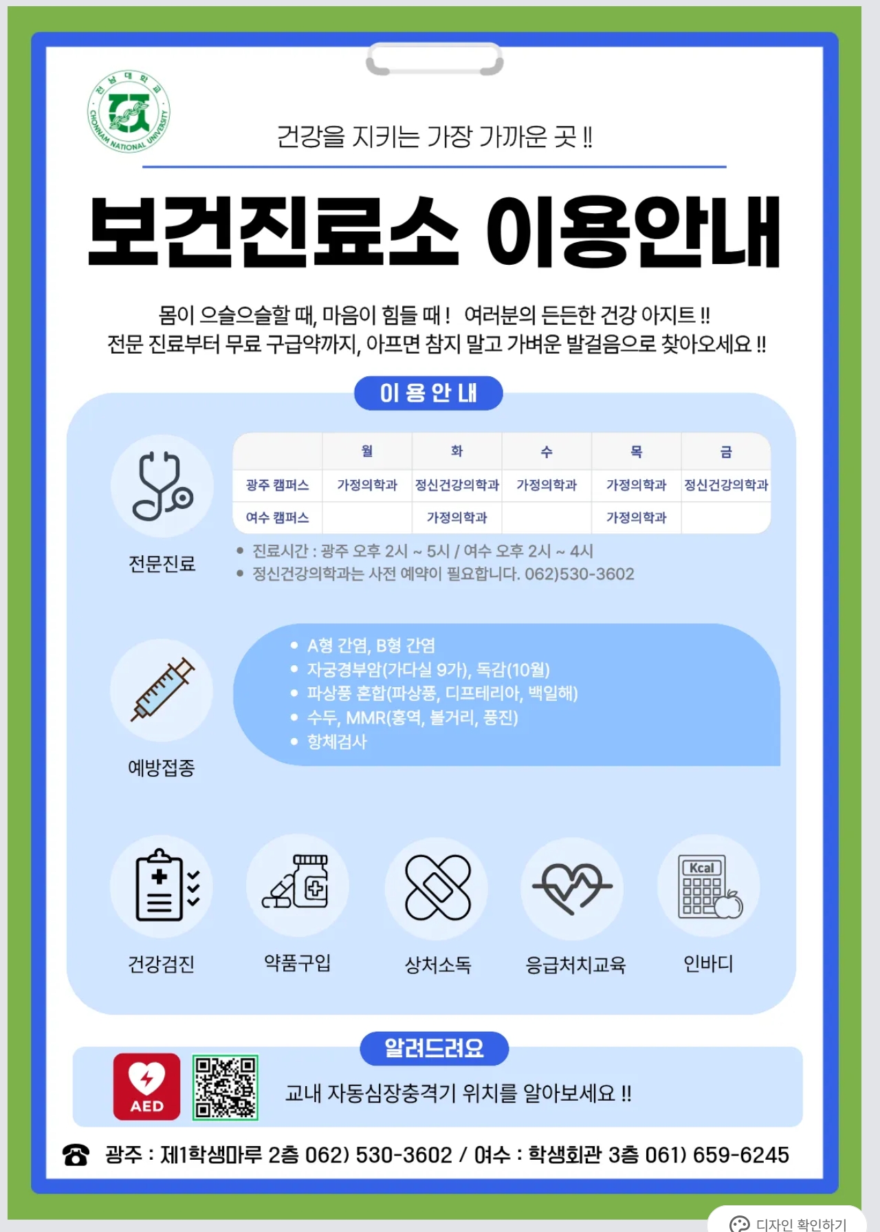 학생 및 교직원 여러분께서는 전문의 진료, 건강상담, 예방접종, 정신건강 지원 등 보건진료소의 다양한 서비스를 적극적으로 활용하여 주시기 바랍니다. 질병의 조기 발견과 예방, 정신건강 증진, 건강한 생활습관 형성에 도움을 받을 수 있습니다. 또한, 건강문제로 인한 학업 및 업무 공백을 최소화하고, 보다 안전하고 활기찬 캠퍼스 생활을 영위할 수 있습니다.